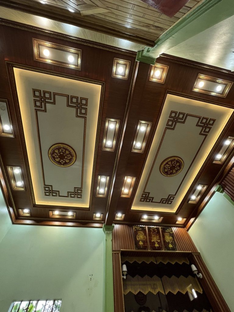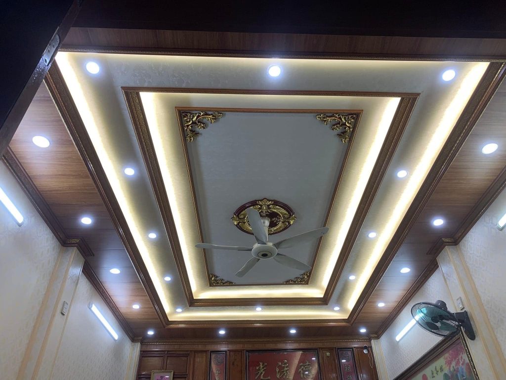 - Tiết kiệm, dễ làm: Trần nhựa thả hoặc PVC vân nhẹ.