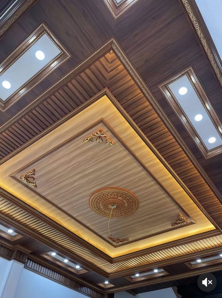 - Trần nhựa giả gỗ: Mô phỏng vân gỗ, tạo cảm giác ấm cúng và gần gũi.
